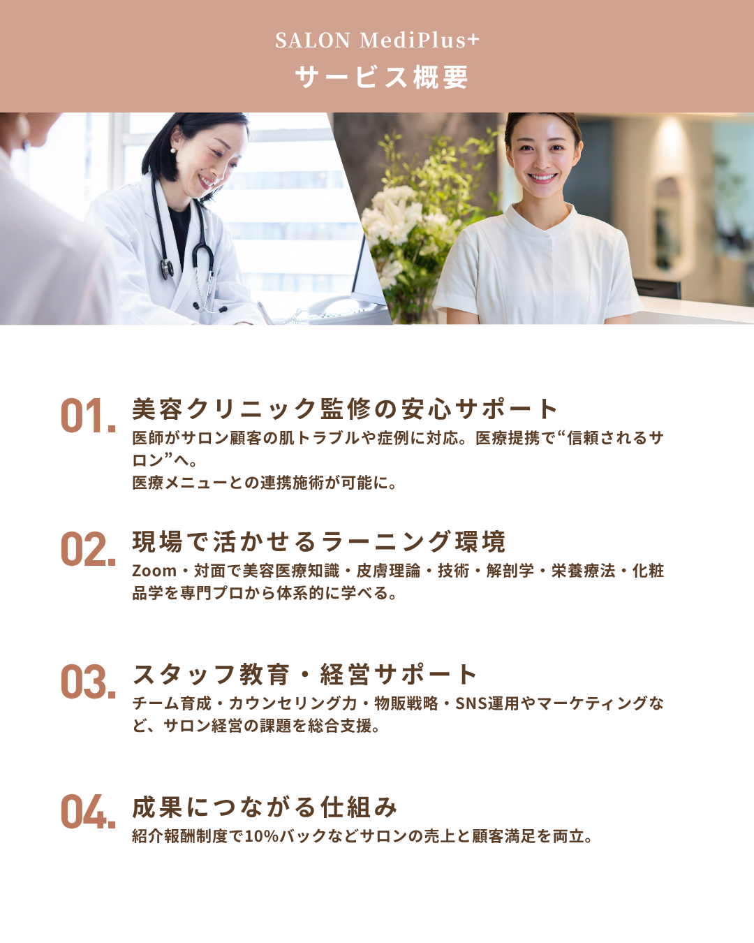 サロン単位でお申込みいただくプランです。(複数店舗を運営の場合は店舗ごとにお申込みが必要です。) 忙しいオーナー様に代わり、スタッフ教育も含まれる充実プラン。 月1回の勉強会や、サロン全体の技術・知識・信頼向上をサポートします。